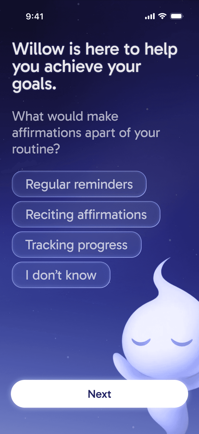 Affirmations work by helping to rewire neural pathways in your brain through repetition and positive reinforcement. When you consistently repeat positive statements, you begin to strengthen the connection between your conscious and unconscious mind, making it easier to recognize and change negative thought patterns. Scientific research suggests that regular affirmation practice can reduce stress, improve problem-solving abilities, and increase overall wellbeing. With Willow, you can set daily reminders to practice your affirmations consistently, which is key to seeing real results over time.